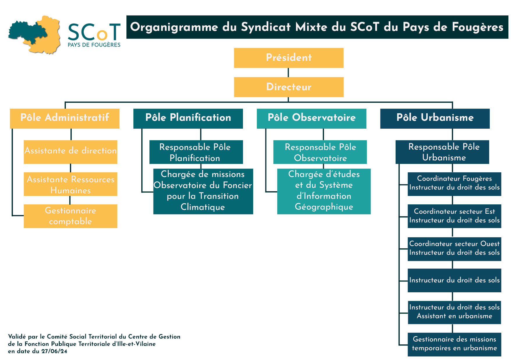Une équipe de 15 agents territoriaux est chargée de mettre en œuvre les décisions des élus du Syndicat mixte du SCoT du pays de Fougères et assure le lien avec les services des intercommunalités, les communes du territoire et les autres organismes ou structures publiques (État, Région Bretagne, Conseil Départemental, Chambres consulaires…) ainsi qu’avec différents partenaires du pays de Fougères (Agence Locale de l’Energie, SEM Orchestr’Am…).